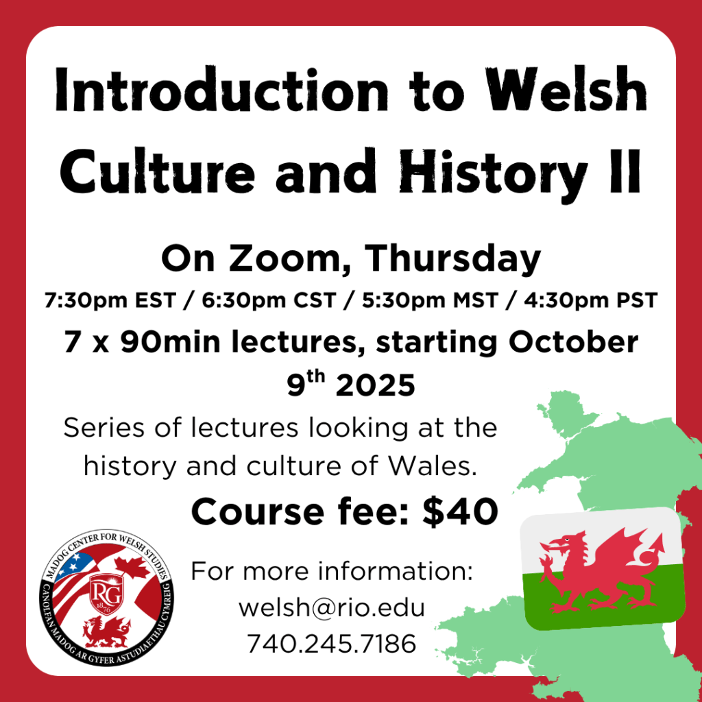 The Welsh-American Heritage Museum and Madog Center for Welsh Studies at the University of Rio Grande / Rio Grande Community College are excited to offer a 7-week follow on from the inaugural “Introduction to Welsh Culture and History” on Zoom.